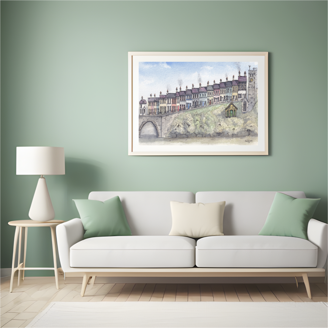 Watercolour caricature print of Bridge Street, Llandeilo, West Wales.