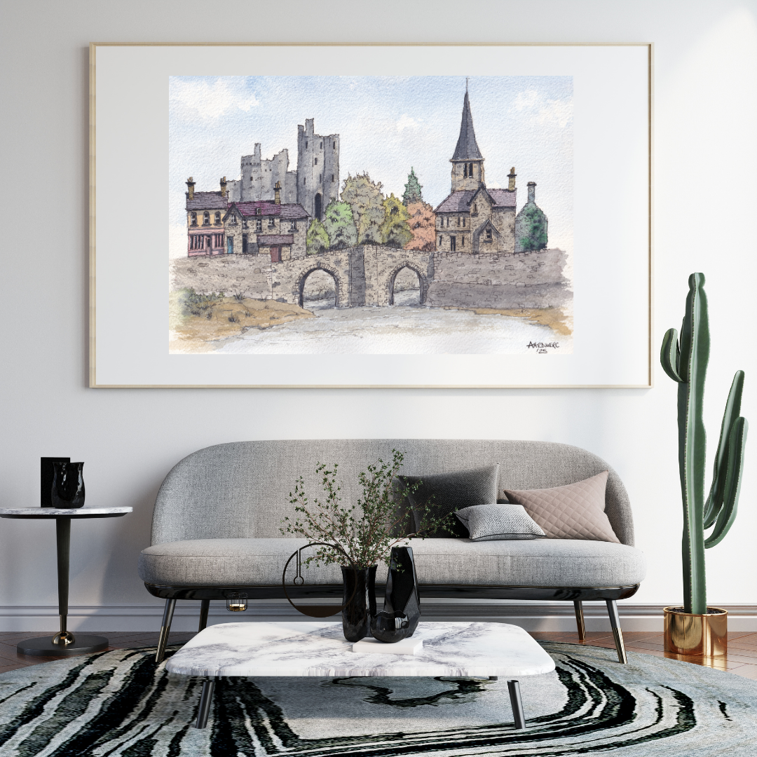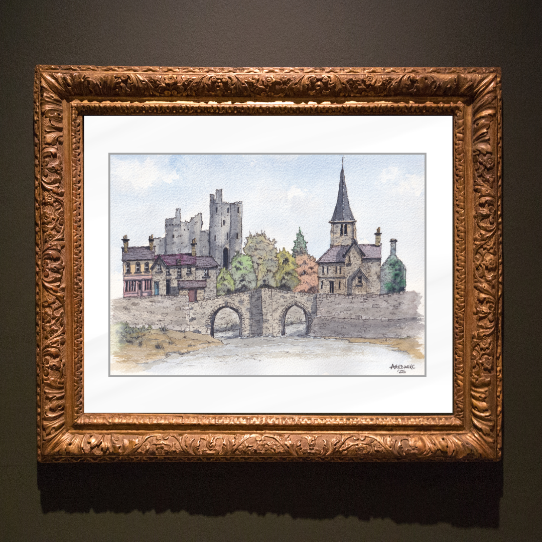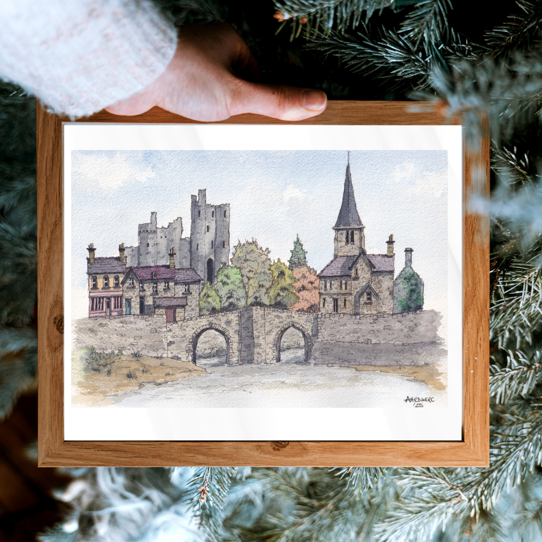 Watercolour caricature print of Kidwelly, West Wales featuring the historic castle and towering church.